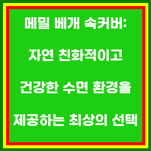 메밀 베개 속커버는 메밀 겨자를 사용하여 만들어진 베개 속커버로, 메밀 겨자는 자연 소재 중 하나로서 피부에 자극이 적고 통기성이 좋아 편안한 수면 환경을 제공합니다. 메밀 베개 속커버는 메밀 겨자의 특성을 살려 만들어졌기 때문에 알레르기 반응이 있는 사람들이 사용하기에도 안전하고 건강에 이로운 소재입니다. 또한 메밀 베개 속커버는 소음을 줄여주고 자외선을 차단해주는 기능도 가지고 있어 편안한 수면을 위한 최상의 선택입니다.