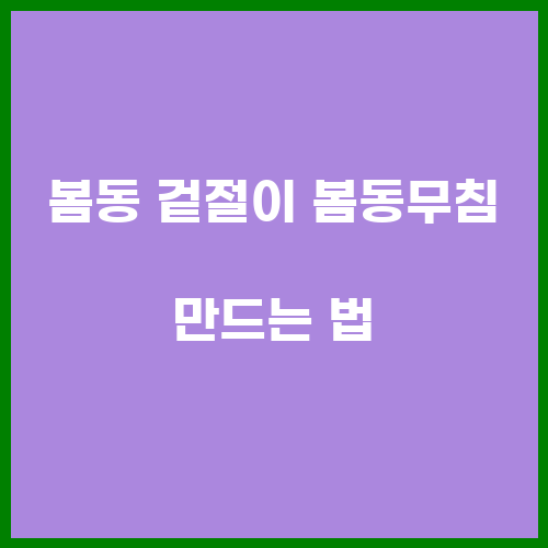 봄동무침을 만들기 위해서는 먼저 봄동을 깨끗이 씻은 후 끓는 물에 데친 후 찬물에 헹궈 물기를 제거해야 합니다. 그리고 봄동을 적당한 크기로 썰어 양념 재료와 함께 넣고 잘 섞어주어야 합니다. 봄동무침을 만들 때는 간장, 고춧가루, 다진 마늘, 참기름, 깨 등의 양념을 사용하는데, 각 재료의 양과 비율을 잘 맞춰야 합니다. 봄동무침은 봄동을 삶은 후 양념을 넣어 식혀 먹는데, 냉장보관이 가능하므로 여러 번 즐길 수 있어서 편리합니다.
