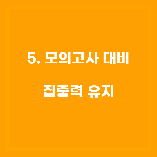 모의고사를 대비할 때 집중력을 유지하는 것도 매우 중요합니다. 모의고사를 푸는 동안에는 주변의 방해 요소를 최소화하고 집중력을 유지하는 것이 중요합니다. 또한, 모의고사를 푸는 동안에는 적절한 휴식을 취하고 몸과 마음을 편안하게 유지하는 것도 중요합니다. 집중력을 유지하기 위해서는 충분한 휴식과 수면이 필요하며, 스트레칭이나 명상을 통해 긴장을 풀어주는 것도 도움이 됩니다.