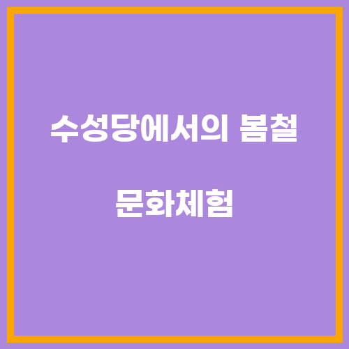 수성당은 봄철에는 다양한 문화체험 프로그램을 제공하여 방문객들에게 특별한 경험을 선사한다. 유채꽃이 만개하는 봄철에는 그 풍성한 아름다움을 느끼며, 전통적인 문화체험을 통해 대구의 역사와 문화를 더 깊이 이해할 수 있다. 수성당에서의 봄철 문화체험은 방문객들에게 색다른 경험을 선사하여 더욱 특별한 여행이 될 것이다.