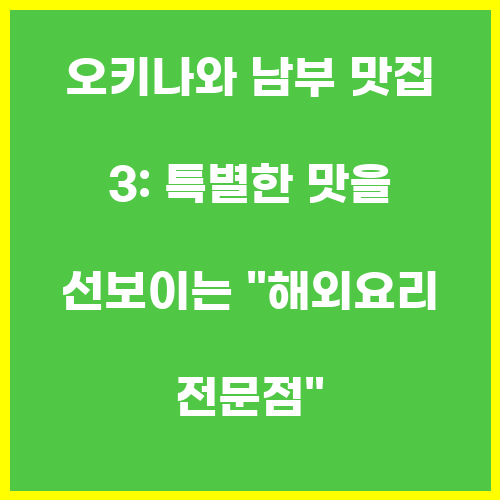 오키나와 남부 지역에는 현지 음식 뿐만 아니라 다양한 해외 요리를 즐길 수 있는 곳도 있습니다. 이 중에서도 "해외요리 전문점"은 다양한 나라의 요리를 맛볼 수 있는 곳으로 손님들에게 큰 인기를 끌고 있습니다. 중국, 이탈리아, 프랑스 등 각 나라의 전통 음식을 맛볼 수 있는 곳으로, 다양한 선택지를 제공하고 있습니다.