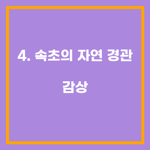 속초는 아름다운 자연 경관으로 유명한 곳으로, 속초를 방문한 이들은 꼭 한번 자연을 즐기는 것이 좋습니다. 속초는 다양한 자연 경관을 감상할 수 있는 곳으로, 특히 해변과 산, 강 등 다양한 자연이 어우러진 곳으로 유명합니다. 속초의 자연을 경험하면서 여행의 피로를 풀고 힐링할 수 있는 좋은 기회가 될 것입니다.