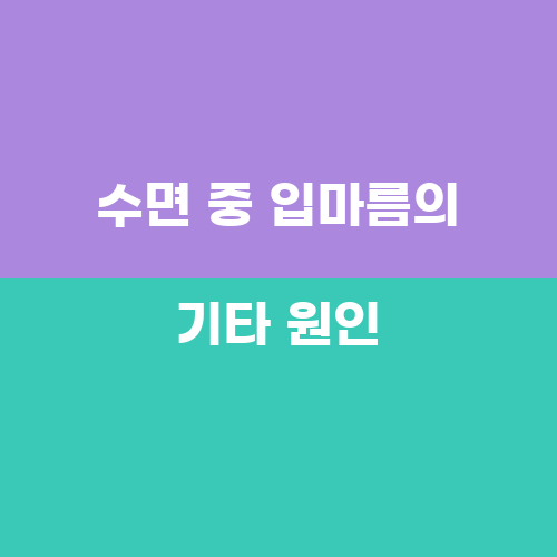 수면 중 입마름의 다른 원인으로는 약물 부작용이나 알코올 소비와 같은 외부 요인이 있습니다. 특히, 알코올은 입마름의 주된 원인 중 하나로 알려져 있으며, 과도한 알코올 소비는 입마름을 유발할 수 있습니다. 또한, 흡연이나 과식도 입마름을 유발할 수 있는 요인 중 하나입니다.