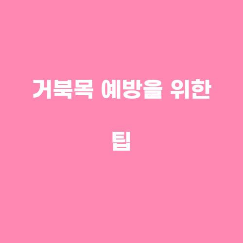 거북목을 예방하기 위해서는 몇 가지 간단한 팁을 따르면 됩니다. 먼저, 일상생활에서 올바른 자세를 유지하는 것이 중요합니다. 또한, 목과 관련된 근육들을 강화하고 스트레칭하는 것도 중요합니다. 또한, 스트레칭 운동을 통해 목과 어깨 근육을 이완시키고 유연성을 높이는 것도 좋은 방법입니다. 또한, 컴퓨터나 스마트폰을 사용할 때는 올바른 자세를 유지하는 것이 중요합니다. 눈높이에 맞춰 화면을 배치하고 등받이 의자를 사용하여 올바른 자세를 유지하는 것이 좋습니다.