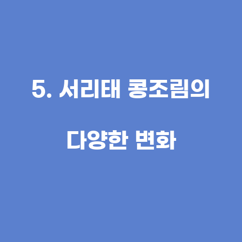 서리태 콩조림은 다양한 방법으로 변화를 줄 수 있습니다. 예를 들어, 콩조림에 고추장을 넣어 매콤한 맛을 낼 수도 있고, 간장 대신 간장을 사용하여 짠맛을 줄 수도 있습니다. 또한, 서리태 대신 다른 재료를 넣어 콩조림을 만들 수도 있습니다. 예를 들어, 고구마나 무나 채소를 넣어 콩조림을 만들면 다양한 맛을 즐길 수 있습니다.
