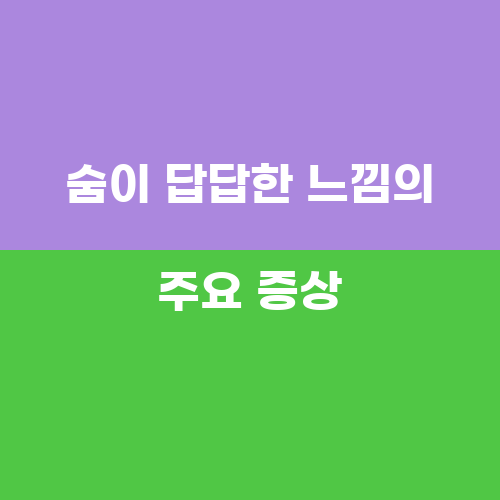 숨이 답답한 느낌은 주로 호흡곤란, 가슴 압박감, 숨막힘, 코 막힘 등의 증상을 동반한다. 호흡곤란은 호흡이 어려워지는 상태를 가리키며, 가슴 압박감은 가슴에 무게가 실린 듯한 느낌을 줄 수 있다. 숨막힘은 숨을 쉬기 어려운 상태를 의미하며, 코 막힘은 코가 막혀 숨을 쉬기 어려운 상태를 말한다.