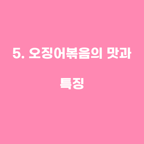 오징어볶음은 매콤하고 짭조름한 맛이 특징입니다. 오징어의 식감과 양념의 조화로운 맛이 입맛을 사로잡습니다. 또한 오징어에 풍부한 단백질과 영양소가 풍부하여 영양가 높은 요리로 손색이 없습니다. 술안주로도 좋고, 식사의 밑반찬으로도 잘 어울리는 요리입니다.