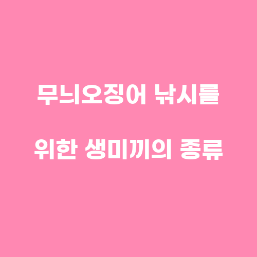 무늬오징어 낚시를 위한 생미끼는 다양한 종류가 있습니다. 주로 생선이나 갑각류를 이용하여 무늬오징어를 유인하며 낚시를 하는데, 생미끼의 종류에 따라 무늬오징어의 반응이 달라질 수 있습니다. 따라서 다양한 종류의 생미끼를 이용하여 무늬오징어 낚시에 도전해 보는 것도 좋은 방법입니다.