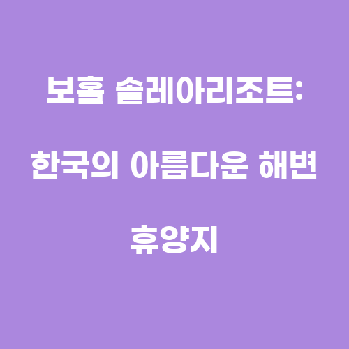 보홀 솔레아리조트는 한국의 아름다운 해변 휴양지로 유명한 리조트로, 그 아름다운 해안선과 푸른 바다가 유명하다. 이 리조트는 청정한 자연환경과 편안한 휴식을 제공하여 관광객들에게 최고의 휴양 체험을 선사한다. 보홀 솔레아리조트는 다양한 편의시설과 서비스를 제공하여 방문객들이 편안하고 즐거운 시간을 보낼 수 있도록 도와준다.