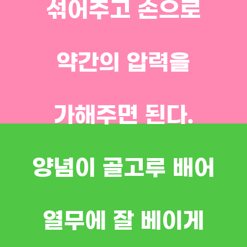 다음으로는 양념장을 열무에 고루 섞어주는 단계다. 준비해 둔 열무에 양념장을 고루 섞어주고 손으로 약간의 압력을 가해주면 된다. 양념이 골고루 배어 열무에 잘 베이게 해야 한다. 양념이 잘 베이면 맛있는 열무 물김치를 만들 수 있다.