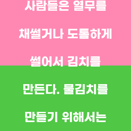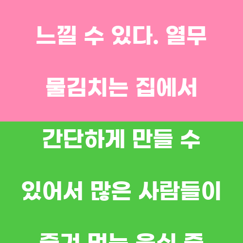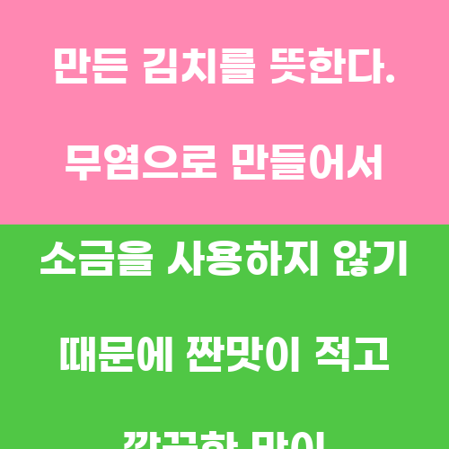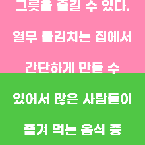 열무 물김치란 무염으로 만든 김치로, 전라도 지방에서 주로 먹는 전통 음식이다. 열무는 무를 뜻하며, 무를 물에 담가서 만든 김치를 뜻한다. 무염으로 만들어서 소금을 사용하지 않기 때문에 짠맛이 적고 깔끔한 맛이 특징이다. 열무는 식감이 부드럽고 씹히는 맛이 좋아서 김치로 만들어 먹으면 상큼하고 시원한 맛을 느낄 수 있다.