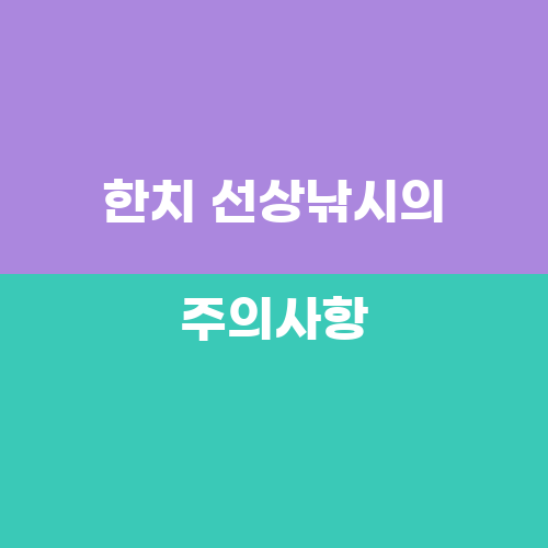 한치 선상낚시를 즐길 때에는 몇 가지 주의사항이 있습니다. 먼저, 낚시를 즐길 때에는 바다 위험에 대비하기 위해 구명조끼를 착용하는 것이 중요합니다. 또한, 바다에서의 안전을 위해 선상에 무리한 행동을 하지 않도록 주의해야 합니다. 또한, 태풍이나 갑작스러운 날씨 변화에 대비하기 위해 낚시 일정을 잡을 때에는 날씨를 미리 확인하는 것이 좋습니다. 또한, 낚은 한치를 처리할 때에는 조리에 필요한 도구와 소스를 준비해야 하며, 화재 예방을 위해 안전에 주의해야 합니다.