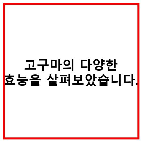 고구마는 다양한 영양소를 풍부하게 함유하고 있어 다양한 건강에 좋은 효능을 가지고 있습니다. 특히 항산화 작용, 혈당 조절 효과, 다이어트 효과, 소화 촉진 효과, 면역력 강화 효과, 뇌 건강에 미치는 영향, 눈 건강에 미치는 영향 등 다양한 효능을 가지고 있어 다양한 질병을 예방하고 건강을 유지하는 데 도움을 줄 수 있습니다. 따라서 고구마를 적절히 섭취하여 건강을 유지하는 데 도움을 받아보세요.