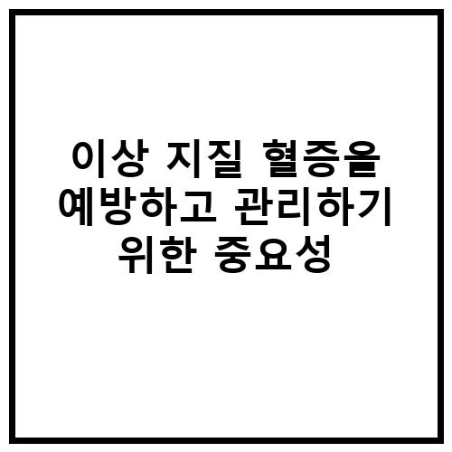 이상 지질 혈증은 심혈관 질환의 주요 위험 요인 중 하나로 여겨지며, 조기 발견과 적절한 관리가 중요합니다. 이상 지질 혈증은 유전적 요인뿐만 아니라 식습관과 생활 습관에도 영향을 받기 때문에, 올바른 식습관과 생활 습관을 유지하는 것이 중요합니다. 이상 지질 혈증을 예방하고 관리하기 위해서는 적절한 식단 및 운동이 필요합니다.
