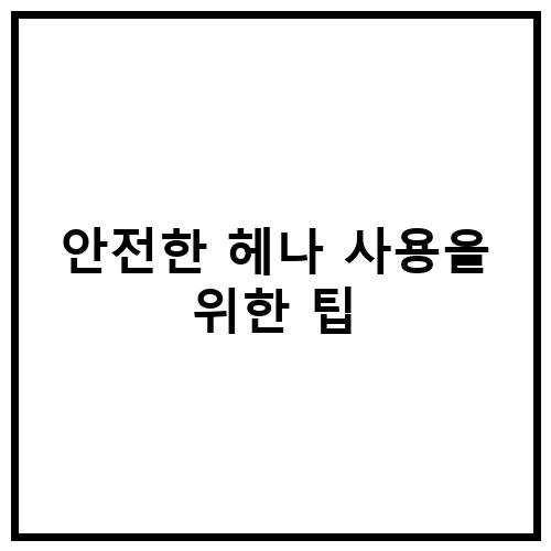 헤나를 안전하게 사용하기 위해서는 몇 가지 팁을 따르는 것이 중요합니다. 먼저, 헤나를 구매할 때는 신뢰할 수 있는 업체에서 구매하는 것이 중요하며, 품질이 좋은 헤나를 선택하는 것이 중요합니다. 또한, 헤나를 사용할 때는 사용 방법을 숙지하고, 피부 테스트를 실시하는 것이 중요합니다. 또한, 헤나를 사용할 때는 피부 상태를 주의하고, 부작용이 나타날 경우에는 즉시 대처하는 것이 중요합니다. 안전한 헤나 사용을 위해서는 사용자의 피부 상태와 민감도를 고려하여 사용해야 하며, 부작용이 나타날 경우에는 즉시 대처하는 것이 중요합니다.